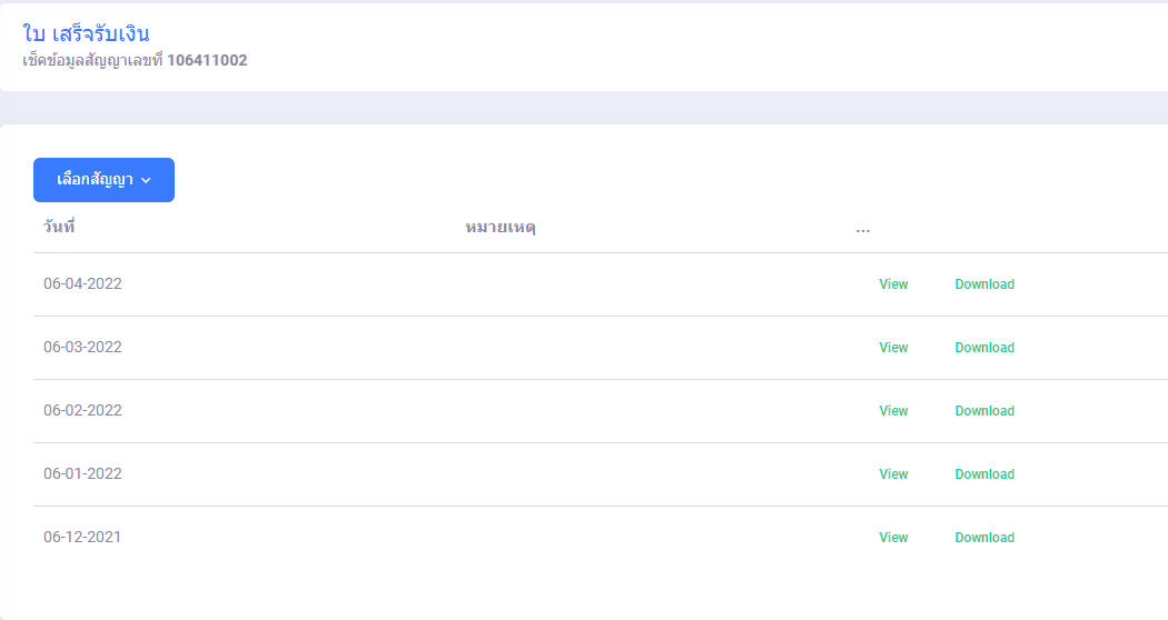 3. เมื่อเข้าสู่ระบบแล้ว > หน้ารายละเอียดสัญญา > คลิก ใบเสร็จรับเงิน (ดูรายการชำระเงิน)